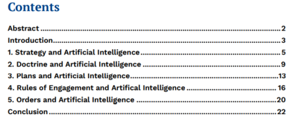 虽然更多的国家发表了关于人工智能的分析和政策,但却没有对未来的军事战略提出见解,北约在2021年通过了其人工智能战略。该战略是整个联盟的人工智能准备和运作的基础,随后是北约的自主实施计划,包括在2022年创建数据和人工智能审查委员会。 欧盟至今没有采取类似的战略,只限于在2020年的《人工智能、机器人和相关技术的伦理问题框架》中鼓励与军事有关的人工智能领域的研究。
