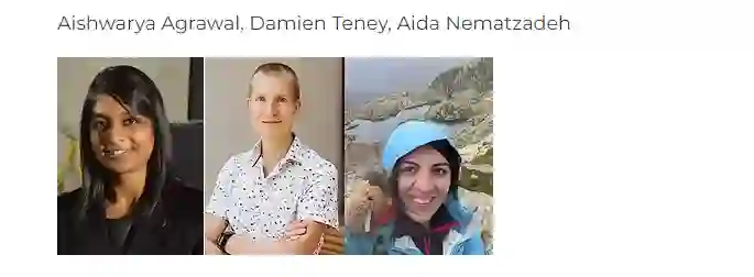 Aishwarya Agrawal (DeepMind, University of Montreal, Mila), Damien Teney (Idiap Research Institute), and Aida Nematzadeh (DeepMind)