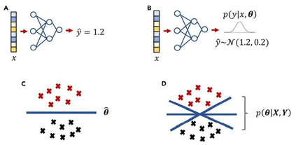 图3 传统神经网络与贝叶斯神经网络的比较 传统神经网络的输出和参数是确定性值(A和C),而在贝叶斯神经网络中它们是分布(B和D)。