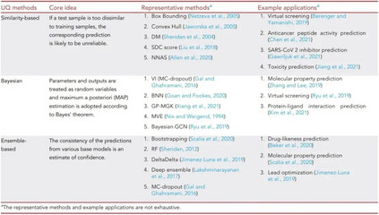 在化学界,长期以来一直存在一些类似于不确定性量化的概念,其中最常见的是QSAR模型的适用性域(applicability domain,AD)。 UQ和AD具有相同的目的:帮助研究人员确定样本的预测结果是否可靠。与UQ相比,传统的AD定义方法更面向输入,一般考虑样本的特征空间或子特征空间,较少考虑模型本身的结构。相应地,UQ的概念更广泛,可以指用于确定预测是否可靠的所有方法。因此,UQ 在概念上涵盖了AD定义方法。在这里,一些经典的AD定义方法被归类为基于相似性的UQ方法,并将在“基于相似性的方法”一节中介绍。 本文将回顾UQ在当前药物设计和发现范式中的概念、方法和应用,更加关注UQ的具体应用案例,并解释所用方法的基本原理,希望能为在药物设计中部署可信的AI模型提供见解和实践指导。 药物发现不确定性的来源 根据不同的来源,不确定性大致可分为三类:近似的(approximation)不确定性、偶然的(aleatoric)不确定性和认识论的不确定性(epistemic uncertainties)。 近似的不确定性解释了由于简单模型无法拟合复杂数据而导致的误差,例如线性模型拟合正弦曲线所产生的误差。 偶然的(aleatoric)不确定性(源自拉丁语alea,意思是掷骰子)描述了待建模的数据的内在随机性(噪声)。这是数据的固有属性,无法通过收集更多的训练数据来减少这种不确定性。在药物发现项目中,数据噪声总是来自于不同的实验测量,这些测量结果因两个主要误差源而变得复杂:系统误差和随机误差。认识论的不确定性(epistemic uncertainties,源自希腊语Greek episteme,意为认识)代表了与样本空间某些区域(例如,模型AD之外的化学空间)缺乏训练模型知识相关的错误。 不确定性量化方法 大量的UQ方法已被部署在药物发现项目中。本文提出了一种新的分类方法来跟踪各种UQ方法的发展路径。通过关注这些UQ方法的理论基础,将其分为三种类型:基于相似性的方法、贝叶斯方法和基于集成的方法。本文总结了他们的核心思想、代表性方法和示例应用 (表1)。以下各节将介绍这些 UQ方法和相关概念。 表1 不确定性量化方法的总结