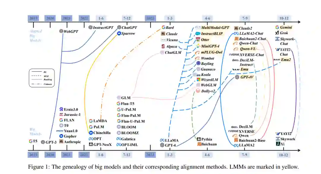 为了解决上述风险,研究人员开发了各种对齐方法,以使LLMs与人类指令、偏好和价值观对齐(Ouyang et al., 2022; Liu et al., 2022; Rafailov et al., 2023)。在LMMs的背景下,"对齐"这一术语传统上指的是不同模态之间的对齐,如视觉和语言(Jia et al., 2021; Radford et al., 2021)。然而,随着LLMs中对齐技术的进步,现在它倾向于代表使LMMs对齐,以使它们遵循人类指令并完成多样化的任务(Liu et al., 2023c; Zhu et al., 2023; Dai et al., 2023)。对齐的概念可以追溯到诺伯特·维纳的表述,“我们最好确信放入机器中的目的是我们真正想要的目的”(Wiener, 1960),这被定义为“A试图做H想要它做的事情”,其中A和H是现代AI研究中的两个智能代理(Yudkowsky, 2016; Christiano, 2018)。随后,对齐的研究在强化学习(RL)领域逐渐获得重要性(Hadfield-Menell et al., 2016; Everitt and Hutter, 2018; Leike et al., 2018),并在大模型时代蓬勃发展(Kenton et al., 2021),培育了多样化的生成模型和多模态模型,如图1所示。良好对齐的AI代理,例如LLMs,不仅具有遵循用户指令从而协助完成任务或回答问题的能力,还有避免生成攻击性或歧视性内容的能力(Askell et al., 2021)。相反,未对齐的AI将会导致潜在风险,如真实性问题、错误信息、上瘾和群体两极分化(Zhuang and Hadfield-Menell, 2020; Pan et al., 2022),如前所述。