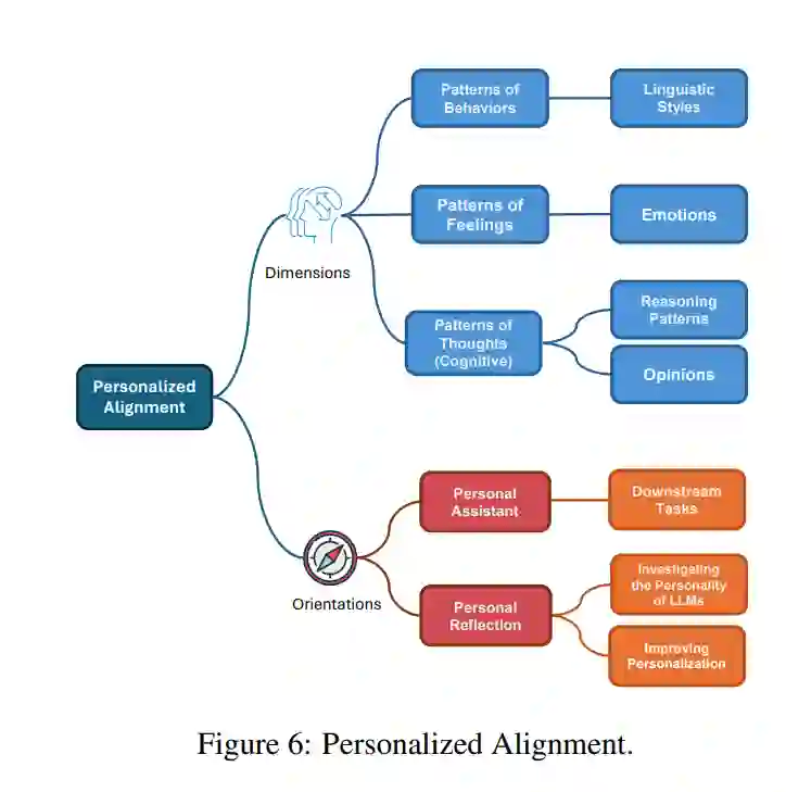 在心理学领域,个性指的是构成个体独特性的独特特征、特质以及思想、感觉和行为模式的模式。由于个性在塑造人类行为中扮演着重要角色,过去几十年提出了大量理论和模型来解释和分类个性的不同方面(McAdams and Pals, 2006; Roccas et al., 2002; Maslow, 1958; Freud, 1975; Bandura and Walters, 1977)。随着大型语言模型在自然语言处理(NLP)中的革命性出现,研究发现,大型语言模型在特定提示配置下可以模拟出可靠和有效的个性(Safdari et al., 2023; Hagendorff, 2023; Jiang et al., 2023),而且对于更大和经过指令微调的模型,LLMs模拟的个性可能更强(Safdari et al., 2023),这为个性化大型语言模型提供了支持。