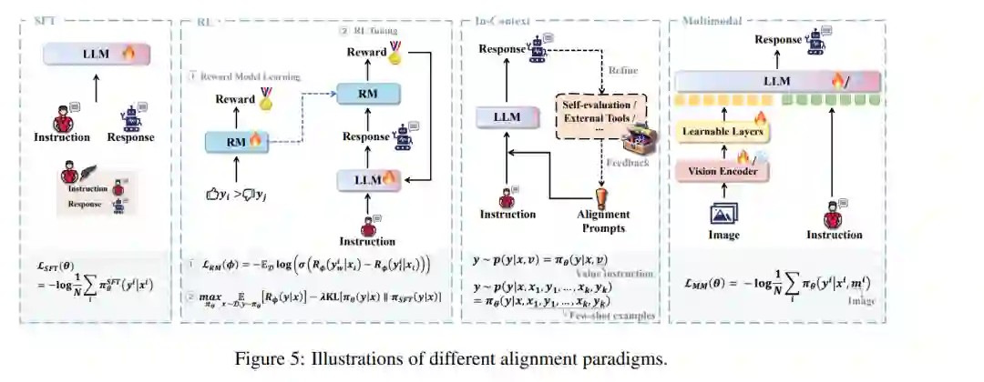 LLMs的对齐方法主要分为三种范式:基于强化学习的对齐(第3.1节)、基于监督式微调的对齐(第3.2节)和上下文内对齐(第3.3节)。在这一节中,我们将介绍和讨论它们,以及个性化对齐(第3.5节)和LMM对齐(第3.4节),并建立它们与第2节中介绍的定义的联系。所有类别的对齐方法都在附录中的图7中总结。