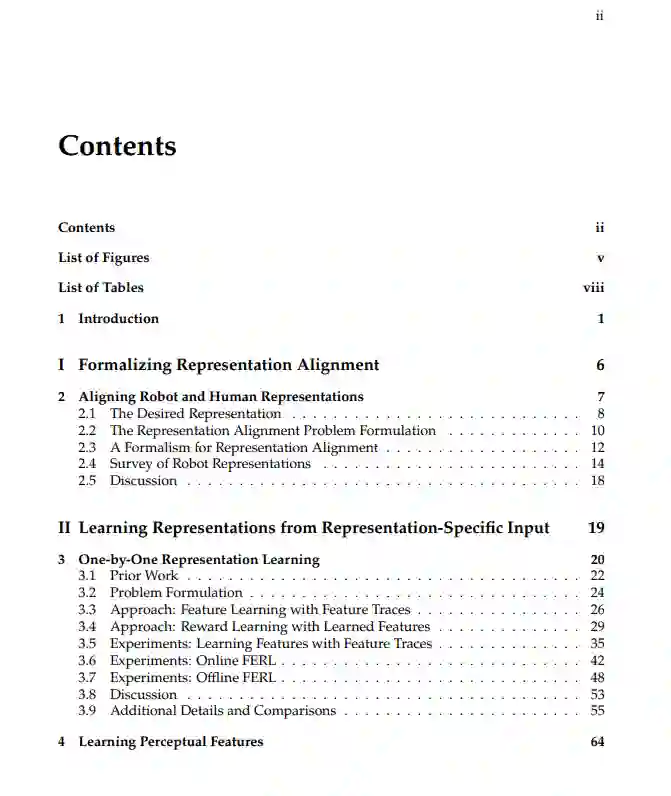 为了了解任务中对人类而言重要的表征,常见的方法依赖于人类行为的数据集,但这些数据无法反映出机器人将会接触到的每个个体、环境和任务。本文主张,我们应该将人类视为互动中的活动参与者,而不是静态的数据源:机器人必须与人类进行互动过程,以找到共享的表征。我们将表征对齐问题形式化为共同寻找共享表征的过程。然后,我们提出,与其希望表征自然一致,不如让人类直接通过特定于表征的输入向机器人传授这些表征。接下来,我们使机器人能够通过估计机器人的表征能够解释人类行为的程度的置信度,自动检测与人类的表征不一致之处。我们演示了与人类对齐的表征如何导致新颖的人类行为模型,其影响超越了机器人技术领域,还涉及计量经济学和认知科学。最后,本论文通过提出问题“机器人如何帮助人机团队达成共享的表征?”来结束,并讨论了未来扩展表征对齐以实现无缝人机交互的研究机会。