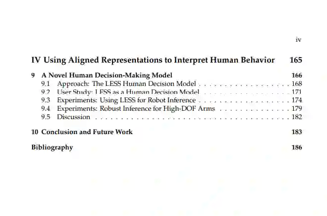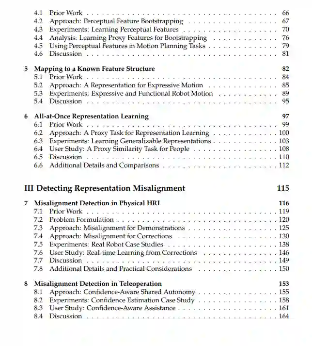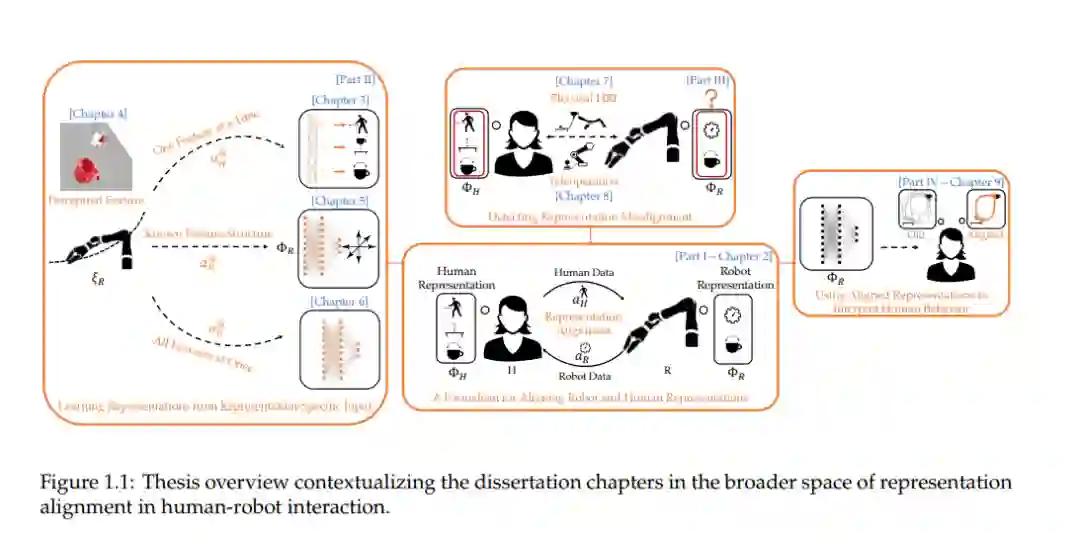 总体而言,本论文通过明确解决表征对齐问题来处理交互,而不是希望它会自然产生。这使我们能够以可扩展、易于访问和稳健的方式将人类行为的认知模型与机器学习方法结合起来,并开发出可靠且透明的与人类对齐的交互实用算法。在整篇论文中,我们通过与真实人类参与者进行机器人实验来评估我们的方法。我们的主要贡献主要在辅助和个人机器人等交互环境中得以展示,但我们的观点对于其他应用领域如自动驾驶、飞行控制系统、送货四旋翼飞行器和半自主外科手术机器人也具有广泛的影响。图1.1提供了论文的四个主要部分的视觉概述(我们在下面简要说明),以及它们如何适应人机交互中表征对齐的更广泛领域。在本论文的结论中,我们讨论了一些未来的研究方向,以实现更加无缝的人机交互。