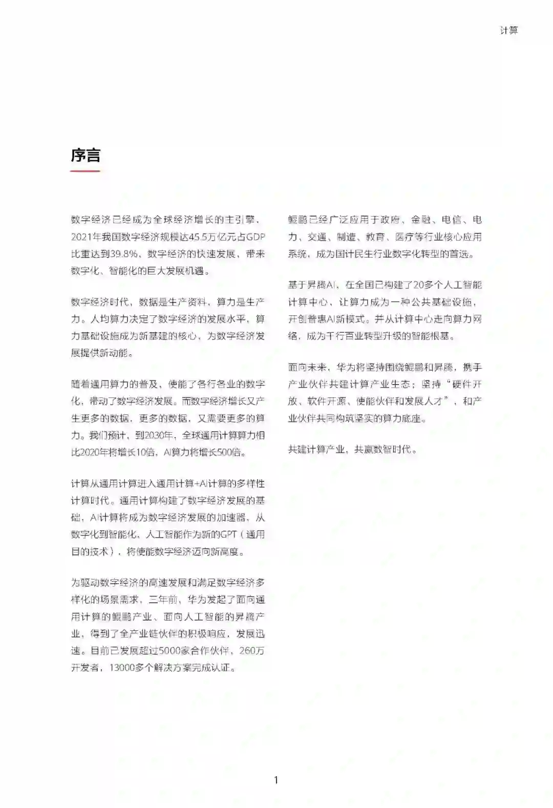 12月2日,华为正式上线《迈向智能世界》计算白皮书(以下简称计算白皮书)。 计算白皮书指出,数字经济已经成为全球经济增长的主引擎,数字经济的快速发展,为数字化、智能化带来巨大的发展机遇。为此,华为提出了六大发展趋势和行动建议,聚焦计算产业根技术创新,持续升级鲲鹏、昇腾AI基础软硬件平台,繁荣产业生态。