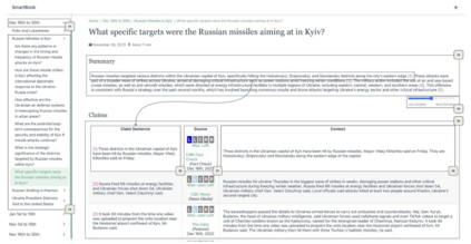 使用为每个章节获取的战略问题作为章节标题,我们纳入聚焦查询的摘要生成来生成每个章节的内容。基于相关主张上下文(图3中的F3)为SmartBook中的每个章节生成一个简洁摘要。近期工作(Goyal等人,2022年;Bhaskar等人,2022年;Reddy等人,2022c年)表明,人类偏好基于提示的大语言模型(Brown等人,2020年;Chowdhery等人,2022年)生成的摘要,胜过在文章-摘要对上微调的模型(Lewis等人,2020年;Zhang等人,2020年;Liu等人,2022年),原因在于更好的可控性和更容易扩展到新场景。对于摘要生成,将前5个最相关的上下文(来自§2.2.3)和指令输入大语言模型(GPT-4),指令要求其根据给定的战略问题进行摘要并包含引用。这种方法不仅通过基于主张上下文有助于保持准确性,还通过允许对照引用来验证而增强了摘要的可信度。