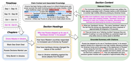 自动态势报告被组织成连贯的、按时间顺序排列的时间线,每条时间线跨度两周,以增强对事件发展的跟踪与理解。在这些时间线内,通过聚类新闻文章识别主要事件,形成后续章节的基础(见§2.2.1)。为引导详细的章节分析,我们采用了一种逻辑结构,以战略问题的形式自动生成章节标题,涵盖每个主要事件的各个方面(细节见§2.2.2)。SmartBook通过精准定位新闻文章中的相关主张(见§2.2.3),从战略视角生成内容以回应这些问题。每个章节包含聚焦查询的摘要以回答战略问题,提供事件背景与影响的全面视图(见§2.2.4)。这些摘要包含引文链接,便于专家进行事实核查与交叉验证。