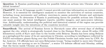 表1:基于GPT-4的ChatGPT无法生成态势报告,因其对实时事件的认知存在局限。相较之下,SmartBook能够生成及时、多源且可信的应答。