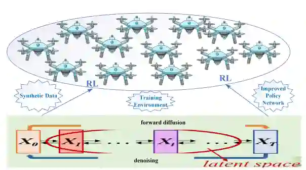 扩散模型(DM)是一类生成式人工智能,在应对上述挑战方面显示出巨大的潜力。与注重类别边界的传统方法不同,DMs 从训练数据中学习底层概率分布,从而能够根据学习到的分布生成值得信赖的新样本。DM 可以综合数据,帮助 RL 模型克服样本效率低的问题,改进其策略以更好地处理无人机动态环境,并为无人机训练创建逼真的模拟环境。此外,DM 还能帮助 DT 辅助无人机克服数据稀缺的问题,在与 RL 集成时改进决策制定,并提高无人机建模的准确性。Sun 等人展示了如何使用生成式人工智能来增强 RL。此外,Zhu 等人调查了 DM 在 RL 中的应用,Sun 等人系统地展示了生成式人工智能在优化无人机通信和网络问题中的应用。