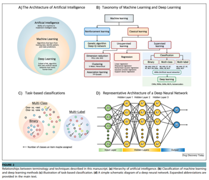 今天用于药物发现的人工智能技术是从早期的机器学习(ML)和化学信息学概念演变而来的。例如,ML在建立定量构效关系(QSAR)模型和毒性预测专家系统方面的应用已经有很长的历史。8-9近年来,这些技术的广泛采用得益于大数据、高级分析、gpu加速、云计算、算法开发和人工智能工具包的民主化从靶标识别到临床前开发,人工智能技术的使用正在推动药物发现和开发连续过程中的新机遇(图1a)。有证据表明,缺乏临床疗效是II期临床研究中最主要的损耗原因,10强调靶点选择仍然是药物发现中最关键的决策点之一。因此,人们希望通过应用人工智能技术来改善目标选择过程。人工智能驱动的靶标发现平台可以从大量复杂、异构的多组学数据中提取和综合靶标相关信息,从而更好地理解靶标生物学,揭示疾病与靶标之间的关联,从而识别出与疾病密切相关的靶标。TargetDB就是这样一个示例,它集成了给定目标上的公开可用数据,并使用基于机器学习的分类系统对目标的可处理性进行分类TargetDB中使用的方法和评分系统为药物开发靶点的配体性评估和优先级划分提供了有用的标准。