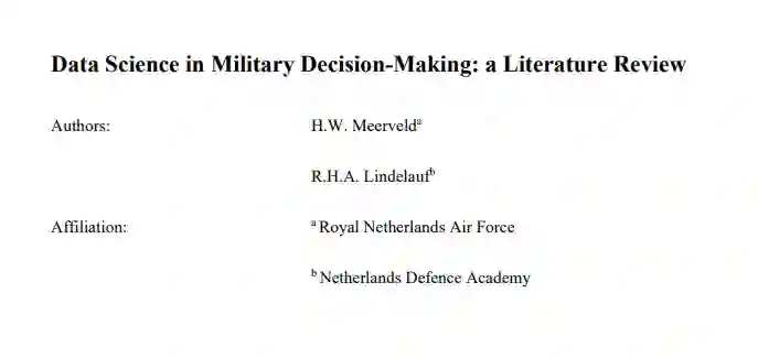 本文的其余部分结构如下。为了把我们的研究放在一个更广泛的角度,第2节概述了先前关于军事决策中的数据科学的研究,我们还提供了数据科学的定义和军事决策发生的战争级别。第3节描述了研究方法,解释了为本文献综述寻找相关文章的过程,我们在第4节介绍并讨论了我们的主要发现。在结论部分,我们概述了本文献综述的理论和实践意义,以及我们研究的局限性。