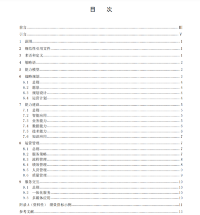 该标准规定了智能客户服务的体系框架,该标准适用于智能客户服务能力建设的需要。智能客户服务体系分为 4 个能力域,15 个能力项,该标准对4 个能力域提出了明确的定义,对 15 个能力项的内涵、量化方法等内容分别作出了说明,是智能客户服务能力建设的主要依据。