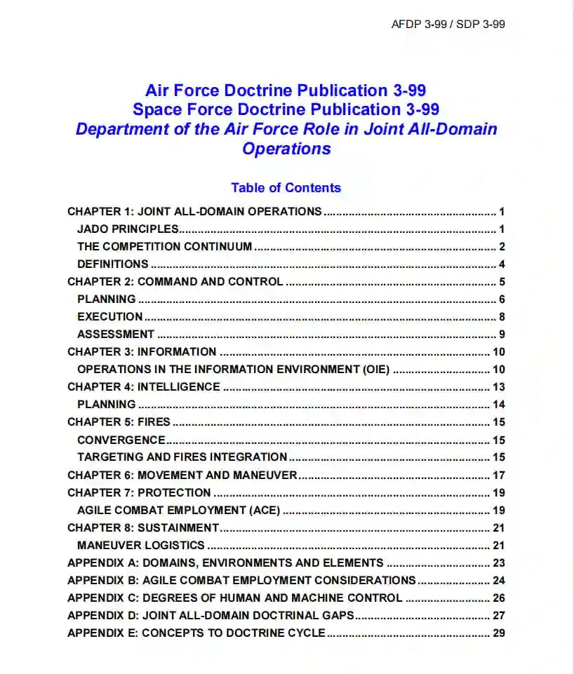 本理论出版物为支持联合全域作战(JADO)的空中和空间部分建立了一个框架。该框架将JADO的愿景与基于作战经验的近期实践方法以及经过战斗检验的作战规划、执行和评估过程结合起来。该出版物指导空军部(DAF)组织和使用提交给联合部队指挥官(JFC)的全部力量和能力。实验、兵棋推演和演习继续完善JADO原则。本出版物的作用,作为新兴的理论,在附录E中有所描述。