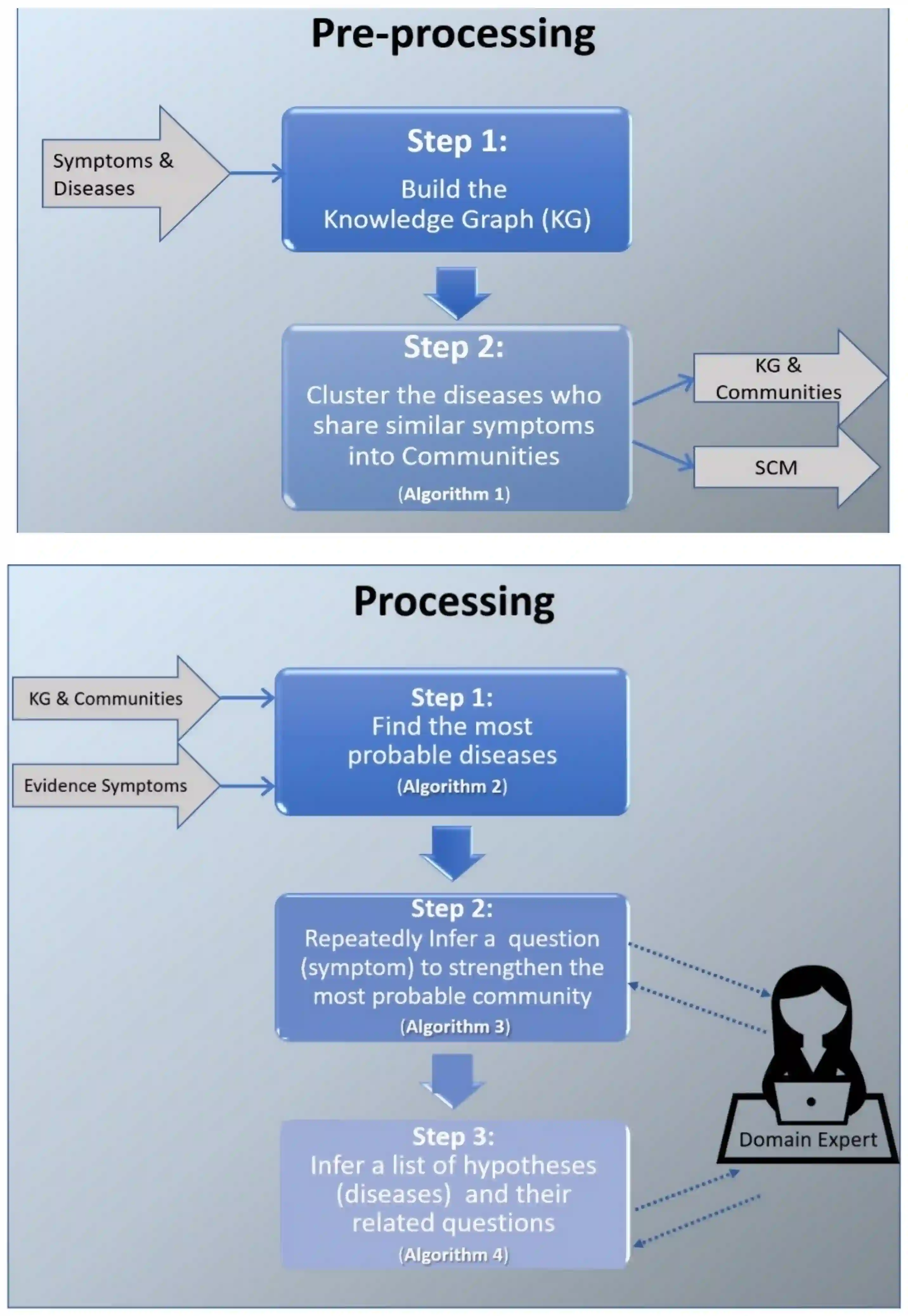 一般来说,我们首先从原始数据建立一个知识图谱,这将有助于探索疾病和症状之间的关系。在此之后,我们在KG上使用鲁汶分层聚类法[21](算法1)来寻找社区(即具有类似症状的疾病群)。然后,给定最终用户报告的症状(称为证据症状),我们使用KG上的推理找到与证据症状相匹配的可能疾病(算法2)。在这一点上,我们推断出最可能的社区,以包括最终用户的疾病,并向领域专家建议一个表明这个社区的问题(症状)(算法3)。最后,我们找到最佳假设建议给领域专家(算法4),也就是说,我们向领域专家建议最终用户可能有的疾病和症状,以解决诊断过程的改进。