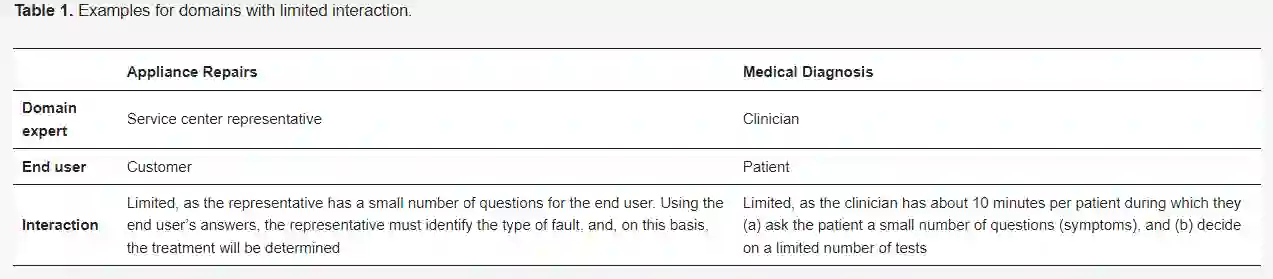 在这项工作中,我们专注于具有以下设置的决策过程:(a)该过程涉及两个实体:一个最终用户和一个领域专家,(b)最终用户启动该过程,(c)两个实体之间存在互动,包括(领域专家的)问题和(最终用户的)答案,(d)两个实体之间的互动尽可能有限(在时间、问题数量、金钱等方面)。