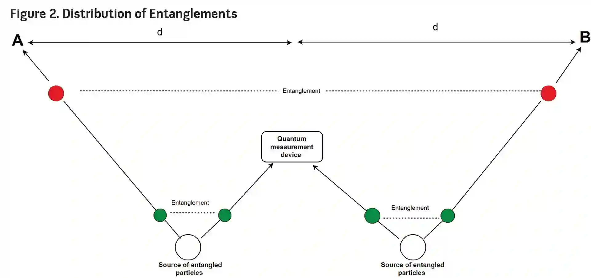 在第三个发展阶段,互联网可以产生一对最大纠缠的量子比特,并将其分配给节点A,另一个分配给节点B。这一阶段绕过了前一阶段的后选要求,使更多的协议可以在节点A和节点B之间进行。这一阶段可以使用真正的量子中继器来实现,其功能是接收一个量子比特,将其与另一个量子比特纠缠在一起,然后将第二个量子比特传递出去(见图2)。这种纠缠量子比特的 "菊花链 "导致了链的初始节点和最终节点之间的纠缠分布。成功分布的纠缠量子比特允许节点使用一个称为量子传送的过程安全地传输量子比特。此外,现在可以在终端节点之间进行新的和更安全的QKD形式,这些新的QKD协议的安全性将不再需要终端用户甚至信任他们自己的测量设备,从而提高他们的安全性。