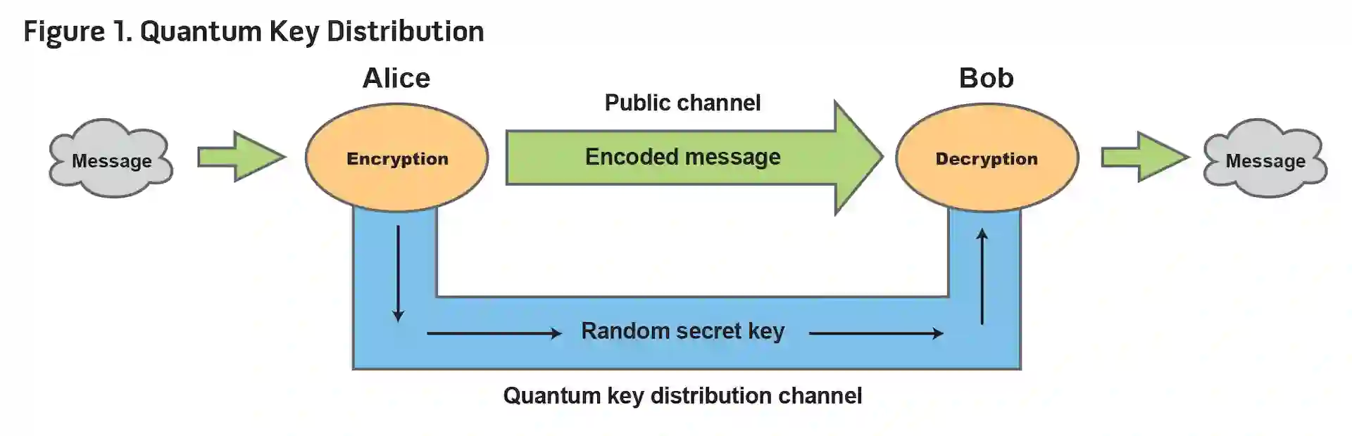 在量子互联网发展的第一阶段,互联网继续只传输经典信息;然而,通过将量子中继器纳入现有的基础设施,它可以更安全地进行传输。在这个阶段,一对量子中继器只需要能够执行一个单一的量子协议,即量子密钥分配(QKD;见图1)。该协议允许生成一个秘密密钥,并安全地分配给相邻的量子中继器。然后,一个经典的信息可以在一个中继器上被编码,安全地传输到下一个中继器,最后被解码。这个过程可以在每一对连续的中继器之间进行,每个中继器产生一个新的秘钥,通过连锁多个中继器来确保经典信息从源头到目的地的传输。可信中继器这一术语源于要求信息在每个中继器上都是可解码的。因此,安全传输依赖于中继器序列的可信度。以这种方式发送信息的好处是,即使在有窃听者的情况下,中继器之间也能保证信息的安全性。如果没有秘钥,信息是无法被解码的,而秘钥在中继器之间分配的安全性是由量子力学定律而不是解密过程的计算难度所保证的。换句话说,除了猜测密钥,现在或将来,即使有强大的计算机甚至量子计算机的帮助,被截获的信息也不可能被解密。