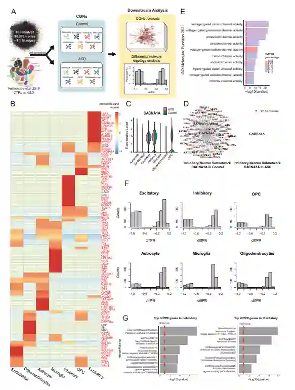 最后,作者还研究了在健康状态下具有高中心性但在疾病状态下具有低中心性的基因是否可能对有关细胞类型特异性疾病机制提供帮助。实验证明,与其他细胞类型相比,兴奋性神经元、抑制性神经元和少突胶质细胞祖细胞的功能缺失基因频率最高(图5F)。在所有细胞类型中,疾病中中心性高但健康对照中中心性低的基因的发生率较低。对神经元中丢失的hub进行基因集富集分析表明,它们的功能主要与神经元活动相关(图5G)。上述实验结果表明,在疾病状态下,这些hub基因失去了与其他基因的大部分相互作用,从而导致ASD的神经元功能失调。相比之下,在ASD网络中变得更加核心的基因并未在与神经元功能相关的通路中富集。