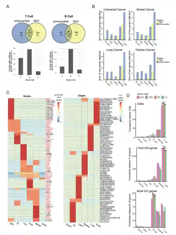 作者预计ICM将在肿瘤浸润细胞的特异性基因中富集。因此,作者汇编了43个先前确定的ICM,并比较了它们与不同细胞类型的scHumanNet hub和DEG的重叠。对于所有细胞类型,实验观察到通过scHumanNet hub基因对ICM的检索率高于DEG (图3B)。此外,在所有的癌症类型和细胞类型中,通过DEG检索到的ICM是scHumanNet检索到的ICM的子集。
