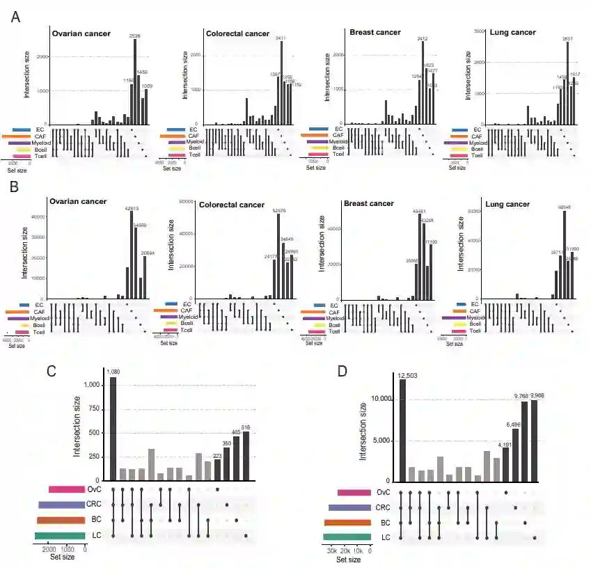 scHumanNet揭示了CGN在不同癌症类型间的共性和差异性 肿瘤浸润细胞在癌症中的功能通常使用细胞类型特异性基因表达进行研究。本文表明,网络生物学可以补充基于表达的功能研究。为此,作者使用scHumanNet构建了T细胞、B细胞、骨髓细胞、ECs、CAFs以及来自乳腺癌、结直肠癌、肺癌和卵巢癌的癌细胞的CGN。接下来,作者研究了这些CGN是否可以提供与细胞类型或疾病状态相关的功能见解。不同类型非癌细胞之间的网络比较显示,在所有癌症中,只有一小部分节点和边在细胞类型之间共享(图2A, B),而很大一部分是在癌症类型中共享(图2C, D)。这些结果表明,scHumanNet生成的CGN主要是由细胞环境而不是疾病或组织环境影响的。