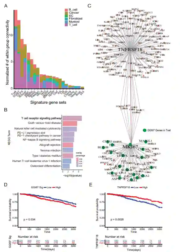 T细胞增殖在免疫治疗反应中很重要。在T细胞网络中的24个GGI97特征基因中,有18个是Ki67的直接邻居(图4C),Ki67是细胞增殖的已知标志物。GGI97特征与生存率低有关,TCGA-BRCA样本中GGI97基因的中位表达证实了这一点(图4D)。为了了解GGI97基因在T细胞中的作用,作者检测了T细胞网络中与GGI97基因直接相关的前10个hub基因。此外,与Ki67直接相连的hub基因GITR(TNSFR18)预后为阳性临床结果 (图4E)。综上所述,研究结果表明,scHumanNet可以将癌症预后特征反卷积到细胞类型中,并确定特定细胞类型治疗方法的关键靶点。