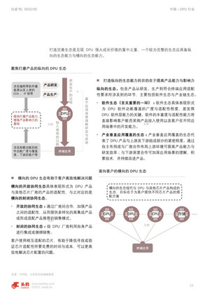 在打磨DPU大规模商业化的阶段,拥有较强适配性并释放客户开发能力的产品更具有竞争优势,软件生态则是形成这一竞争优势的关键。此外,中国芯片厂商还可以打造产业链生态以及横向的协同生态,提高研发效率、打造多样化产品,从而把握行业发展的机遇。以DPU为中心,联合芯片行业各方协同发展,将有望推动中国芯片行业整体发展。