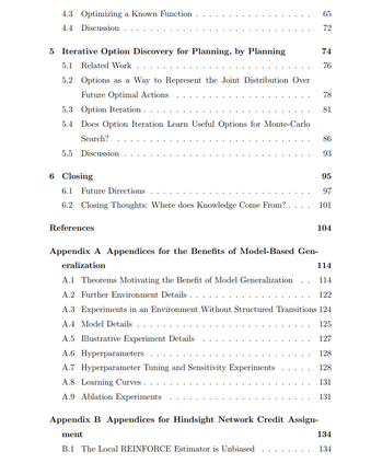 第三个贡献是提出了一种选项发现的方法,该方法的动机是,由于世界的时空局部性结构,时间上连续状态中的最优动作往往是强相关的。基于这一想法,我提出了一种称为选项迭代(Option Iteration, OptIt)的方法,该方法从计算成本高昂的搜索程序的结果中提炼出一组选项。直观上,OptIt旨在发现一组选项,使得对于某长度的每个轨迹段,这组选项中的至少一个与在该段中的每个状态运行搜索程序所得到的改进策略相匹配。这导致了捕捉时间上连续状态中最佳动作之间关系的选项,同时允许在给定情况下哪个选项最佳存在不确定性。生成的选项集指导搜索程序,通过迭代改进过程,使得更好的选项导致更好的搜索,从而促进更好的选项发现。可以合理地认为,先验的结构知识对于实现有意义的学习是必要的。然而,过去几十年的研究表明,将特定的人类专业知识编码到系统中,长期来看往往不如那些能够随着计算和数据扩展的方法。承认这一点,我们应将精力集中在开发利用尽可能通用的结构的方法上,使代理能够从经验和计算中学习到更具体的世界知识。由于具有广泛适用性,通用结构可以更好地修剪解决方案的搜索空间,并在应用更多计算和数据时仍然相关。另一方面,尽管特定结构可能在早期提高性能,但随着学习和通用结构的结合推导出这些结构,它可能很快变得无关紧要。虽然并不总是清楚通用与特定结构之间的界限在哪里,但承认存在这种权衡提供了一个有用的指导方针,指明了哪些研究方向值得追求。