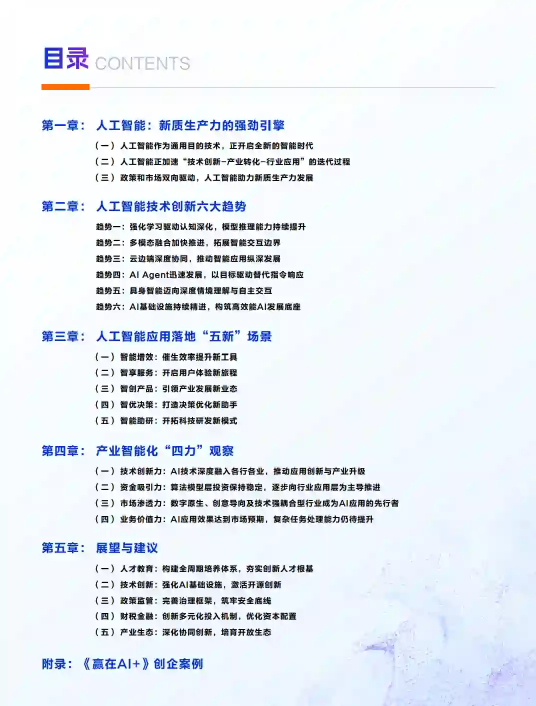 人工智能作为战略性的通用目的技术,正在重构生产要素配置方式,催生新型产业形态,其引发的“人工智能+”效应已从技术范式创新上升为驱动经济高质量发展的核心动能,其发展水平直接关系到国家竞争力强弱与现代化经济体系建设进程。全球主要经济体纷纷将人工智能纳入国家战略体系,2024年我国也首次将“人工智能+”写入《政府工作报告》,2025年政府工作报告进一步指出,要持续推进“人工智能+”行动,支持大模型广泛应用。 人工智能技术正呈现多点突破、交叉融合的发展态势。算法层面,大模型技术突破推动生成式AI实现质的飞跃,深度推理、多模态融合等技术不断突破认知边界;算力层面,AI芯片能效比持续提升,极致的工程优化让算力持续释放;数据层面,高质量行业数据集以及合成数据为模型训练以及应用构建提供新动能。技术迭代催生AI产业化,并推动各行业智能化应用全面开花:在文化传媒领域,AIGC大幅提升创作效率;医疗领域,人工智能加速药物研发创新,并提升辅助诊断的精确度;制造业中,人工智能助力产品设计、生产排程优化、提升质量检测与缺陷识别效率等,推动制造的全流程智能化升级。当前,人工智能技术正加速“创新-转化-应用”的迭代过程,为各行各业注入新质生产力,促进技术经济系统的协同进化,重构产业价值网络。 2025年,是全球人工智能应用加速落地的一年。为积极响应“人工智能+”国家重要战略,中央广播电视总台与杭州市人民政府联合主办纪实创投类节目《赢在AI+》,致力于推动技术创新与产业融合,展示全国各地人工智能技术创新和应用的优秀创业企业,汇集院士、专家、投资者、优秀企业家等不同维度的精粹观点,为未来的企业,寻找企业的未来。