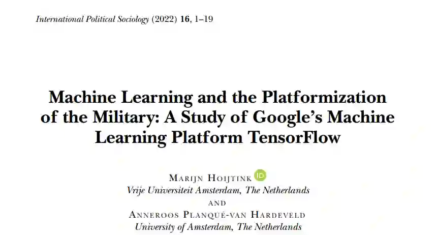 在武装部队越来越多地使用自动学习技术(机器学习,ML)的背景下,在我们的文章中,我们描述了关于ML平台的一个分析视角,目的是理解ML在武装部队中的发展以及其影响。采用一种关于平台的物质和技术观点,就像在关于新的通信媒体的研究中所开发的那样,并在安全问题的研究中提及这一信息、 我们认为,有必要集中研究平台和技术工作,以了解数字技术的发展和安全实践的结构。通过对谷歌开放的ML平台TensorFlow的详细研究,以及美国国防部的交互式战斗机设备的辩论,美国国防部的Proyectamento de Defensa,即美国国防部。美国的Proyecto Maven,实现了两个更广泛的贡献。首先,我们确定了一个更广泛的武装部队 "平台",其中我们指的是ML平台(技术/材料)的不断参与和渗透,作为一种基础设施,允许在武装部队中进行新的分散的算法开发和实验实践。第二,我们注意到这一平台正伴随着武装部队和公司统治者之间的新冲突,特别是那些在这一背景下发挥重要作用的大型科技公司,以及在这一平台上组织起来的无国籍社区。