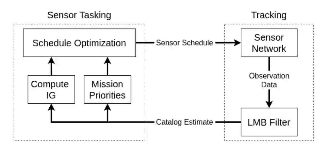 分析的第一个问题是大型星座跟踪问题。我们模拟了一个由 4,500 多颗低地球轨道卫星组成的星座,并使用 12 个地面近视传感器网络对其进行跟踪。这些传感器的任务由一个结合了信息论奖励的成本函数来完成。我们还利用战术重要性函数,将基于任务的目标(如有碰撞风险的物体的优先级)纳入任务分配逻辑。收集到的数据将通过一个带标记的多贝努利滤波器进行处理。滤波器产生的状态目录估计值用于激励下一轮传感器任务分配,从而形成一个用于综合任务分配和跟踪的自主闭环系统。经过五天的跟踪期后,状态目录估计值将用于执行会合分析。我们将现有方法结合起来,为卫星间近距离接近的过滤和风险量化提供了一个计算效率高的工作流程。