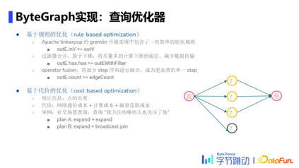 RBO主要基于Gremlin开源实现中的自带优化规则、针对字节应用中的算子下推、自定义的算子优化(fusion)三大规则。CBO本质上是对每个点的出入度做统计,把代价用方程量化表示。