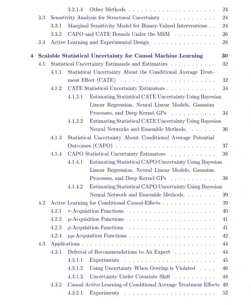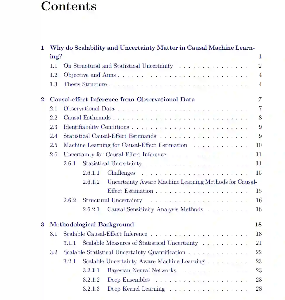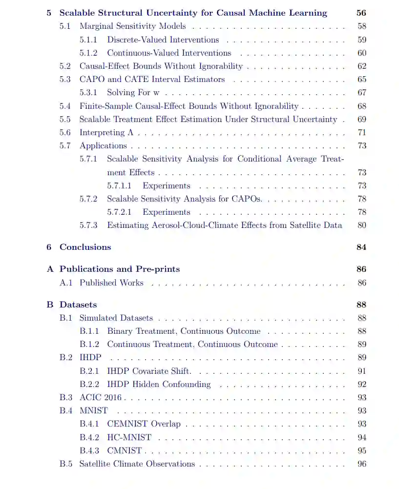 因果机器学习 (Causal ML) 处理多种任务,包括因果效应推断、因果推理和因果结构发现。本论文探讨了适用于大规模数据集和复杂高维输入/输出模式(如图像、文本、时间序列和视频)的因果机器学习方法中的不确定性。为了有效处理海量信息并预测复杂关系,可扩展性至关重要。随着模型规模的扩大和灵活性增强,传达未知信息变得愈发重要。我们研究了两种主要的不确定性类型:统计不确定性和结构不确定性。统计不确定性是在将机器学习模型拟合到有限数据集时产生的。解决这种不确定性可以预测一系列可能的因果效应,并随着训练样本的增加而缩小范围,从而有助于做出更明智的决策,并指出需要进一步理解的领域。结构不确定性则来自对因果结构的不精确认知,通常需要对数据生成过程或与世界的交互做出进一步假设。在本论文中,我们开发了能够有效应对统计和结构不确定性的可扩展因果机器学习方法。我们展示了在因果机器学习算法设计和应用中考虑可扩展性和不确定性的重要性,从而增强决策能力和知识获取。我们的研究贡献旨在推动因果机器学习领域的发展,并为未来研究奠定基础。