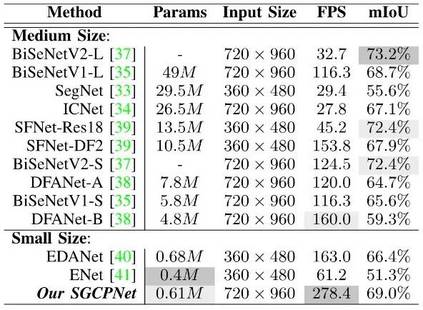 中型模型的存储和计算开销远小于大型模型,它们在效率方面往往能取得较为良好的表现,如SFNet-DF1[39]和DFANet [38]可以实现大约100 FPS的分割速度,并且模型参数也小于10 M。小尺寸模型的存储和计算成本成通常很小,因此它们比较适用于资源受限的场景。表2表明SGCPNet在所对比的模型中具有第二小的模型尺寸(Params = 0.61 M),且它的模型参数比中型和大型模型小几十、甚至几百倍。此外,该模型在几乎所有的分辨率上都具有最小的FLOPs和更快的分割速度。