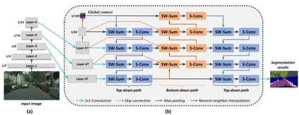 图5. 基于空间细节引导的上下文传播网络(SGCPNet)。其中,“SW-Sum”表示标量加权求和操作,“S-Conv”表示可分离卷积。此外,(a)表示骨干网络,(b)表示SGCP模块。