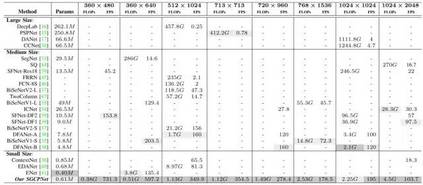 本节将SGCPNet与相关模型在效率方面进行了详细的对比,其中采用了三个主流的评估指标,即模型参数(Params)、浮点运算量(FLOPs)、每秒分割帧数(FPS)。为了更好地比较,相关模型被划分为三类:1)大尺寸模型;2)中尺寸模型;3)小尺寸模型。其中,大尺寸模型表示模型的Params和FLOPs同时大于50M和300G。中尺寸模型指模型的Params在1M到50M之间,或FLOPs在10G到300G之间。在小型模型中,Params和FLOPs应同时小于1M和10 G。根据该分类标准, SGCPNet显然属于小尺寸模型,因其只包含约0.61M的参数,并且它的FLOPs明显小于10G(如,即使分割一张1024×2048图片,其计算成本也仅为4.5 GFLOPs)。
