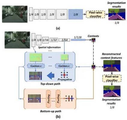 图3. 基于空间细节引导的上下文传播策略示意图(即,(b))。在图中,(a)表示传统语义分割方法,即同时保持神经网络内的空间细节并聚合上图像的下文信息。