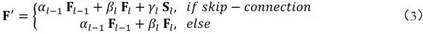 其中F_{l-1}和F_{l}分别表示来自第(l-1)层和第l层的特征图。特别地,F_{l-1}包含更多的空间细节信息,而 F_{l}包含更多的上下文信息。如公式(3)所示,当存在跳跃连接时,进一步考虑来自第l层的特征S_{l}。标量\alpha_{l-1}、\beta_{l}和\gamma_{l}是可学习的权重,用于控制F_{l-1}、F_{l}和S_{l}之间的平衡。根据公式(3),基于空间细节引导的上下文传播策略可以被重新解释如下:通过利用F_{l-1}中所包含的空间细节的引导,将F_{l}中的上下文传播到邻域,在上下文信息的传播过程中F'中的空间细节信息被逐步重构。