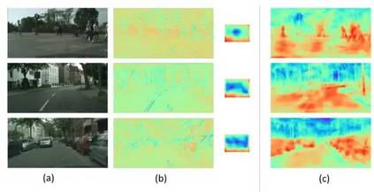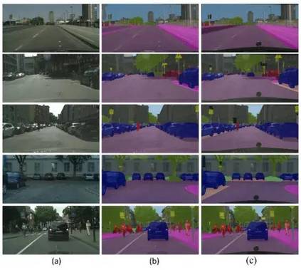 图7. 本方法在Cityscapes验证集上的一些典型的分割结果示例。其中,(a)表示输入RGB图片,(b)表示本方法所得到的分割结果,(c)表示分割的真值标签。