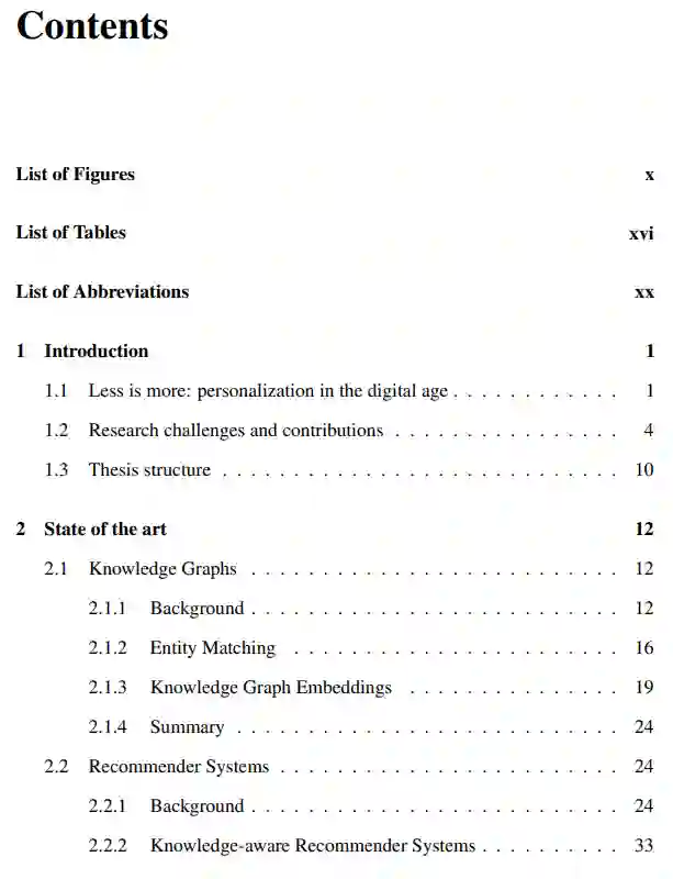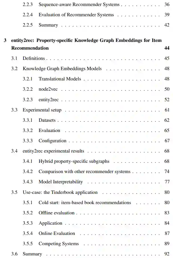 第三章包含了关于使用翻译模型[25, 26]、node2vec[27]和entity2rec[3]来为推荐系统创建知识图谱嵌入的理论和实验工作。