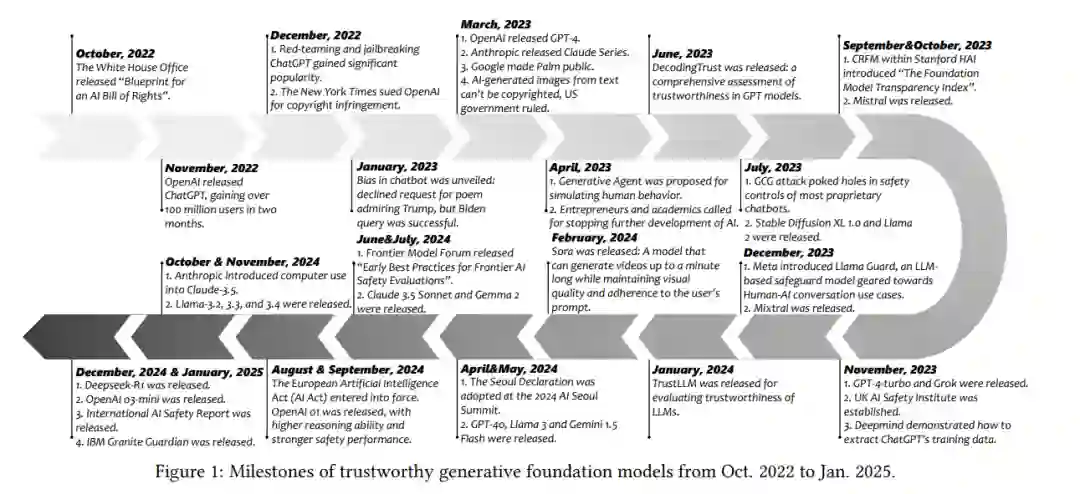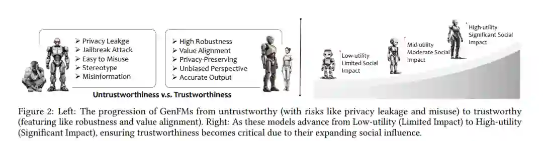 生成模型是一类通过学习底层数据分布并生成与训练数据集特征相似的新数据实例的机器学习模型[1, 2]。由于其广泛的应用,如生成逼真的图像[3]、文本[4, 5]或视频[6],以及在科学发现[7, 8, 9, 10]、医疗保健[11, 12, 13, 14]和自主系统[15, 16, 17]等领域的潜在推动作用,这些模型受到了广泛关注。常见的生成模型包括生成对抗网络(GANs)[18]、变分自编码器(VAEs)[19]、扩散模型[20]以及大语言模型(LLMs)[21],这些模型在生成与人类创作难以区分的内容方面展现了卓越的能力。 近年来,基础模型(Foundation Models)——定义为大规模预训练模型(从BERT[22, 23, 24]、OpenAI的GPT系列[25, 26, 27]到Llama模型家族[28, 29, 30])——将生成建模推向了新的高度。这些模型通过在预训练阶段广泛使用海量数据集[32]和计算资源[33],能够在多样化应用中有效泛化[34, 35, 36, 37, 38, 39]。 基础模型可能服务于多种任务;例如,非生成式基础模型如BERT[22]主要用于文本分类或语言理解任务,而非内容生成。相比之下,生成式基础模型(GenFMs)[40]专门用于生成任务,擅长基于训练数据生成新的图像、文本或其他数据形式。正式而言,GenFMs指通过大规模预训练在多模态和领域中表现出色的生成任务架构。这些模型通过推动内容创作、决策和自主系统的边界,有望彻底改变行业[16, 15],从而凸显其在研究和实际应用中的变革潜力。 随着GenFMs在各行各业中的广泛应用,确保其可信度已成为一个紧迫问题。如图1所示,对可信度的关注与GenFMs的发展同步增长。即使是最先进的模型(如GPT-4)也表现出对新型攻击(如“越狱”攻击[41])的脆弱性,这些攻击可能绕过设计的安全措施[42]。随着GenFMs行为不可预测或不道德的事件增加,解决其可靠性的紧迫性不容忽视[43]。例如,流行的文本到图像模型(如DALL-E-3[3])已被操纵以绕过安全过滤器[44, 45],而LLMs则引发了关于隐私泄露的严重担忧[46]。GenFMs生成的逼真输出(无论是文本、图像还是视频)通常与人类创作的内容难以区分,这带来了重大风险,包括错误信息的传播[47]、深度伪造的创建[48]以及偏见或有害叙事的放大[49]。如图2所示,随着GenFMs的社会影响不断扩大,这些问题可能削弱公众对技术本身及其使用机构的信任[50]。 建立对GenFMs的信任比传统模型(如不具备生成能力的BERT[22])更为复杂,后者通常设计用于在特定、明确的任务中表现出色。相比之下,基础模型通过在海量异构数据集上进行预训练,能够在广泛的应用中泛化[51]。这种广泛的通用性引入了评估可信度的重大挑战,因为它需要评估模型在多样化任务和上下文中的行为,以确保一致的可信度和对道德标准的遵守。此外,GenFMs的社会影响远超传统模型[50]。虽然后者可能影响特定领域,但GenFMs有可能塑造公众舆论、影响政策决策,并生成模仿权威来源的内容,从而可能破坏民主进程和更广泛的信息生态系统[31, 52]。 GenFMs的规模和复杂性(通常包含数十亿参数)使其本质上不透明且难以解释。这种透明度的缺乏使得在模型产生具有深远社会影响的输出时,建立问责制变得复杂。此外,这些模型的动态性——通过微调和更新不断演变——对保持一致的安全协议、确保道德准则的遵守以及建立可追溯性机制提出了额外挑战。这些因素共同强调了建立严格框架以评估和增强GenFMs可信度的紧迫性,确保其安全且负责任地集成到关键应用中。 尽管主要公司在增强GenFMs可信度方面做出了重大努力——例如OpenAI建立红队网络以加强模型安全性[53]、谷歌发布负责任AI开发的最佳实践[54, 55, 56]以及Meta发布Llama Guard以保护提示完整性[57]——一个关键且紧迫的问题仍未得到解答:GenFMs可信度的内在局限性和不确定性是什么?在多样化且动态的现实环境中,GenFMs能在多大程度上保持真实性、安全性、隐私性等关键可信度维度? 鉴于GenFMs的先进能力和深远影响,建立一个统一的框架来定义、评估和指导其可信度的提升至关重要。目前,各公司和开发者已独立定义了生成模型的可信度原则、模型规范和用户政策(详见§2.1)。同时,许多政府和监管机构也引入了多样化的法律法规来定义可信的生成式AI模型。尽管一些司法管辖区采用横向治理框架(如欧盟AI法案[58]和AI权利法案蓝图[59])来整体监管AI系统,但其他地区则实施了针对特定领域的垂直监管方法,如生成式AI服务[60]和医疗保健应用[61]。然而,这些标准高度多样化,通常反映了不同利益相关者的特定优先事项。这种缺乏一致性导致了可信度定义的碎片化,有时甚至相互冲突或不一致。我们希望通过提出一套标准化指南来解决这一差距。通过综合现有原则、政策和法规,我们旨在提炼出一套统一的指南,作为基础参考。这些指南旨在提供一致、跨学科的框架,以评估和定义GenFMs的可信度,为新开发者和政策制定者提供清晰的起点,并促进跨行业和监管环境的一致性。