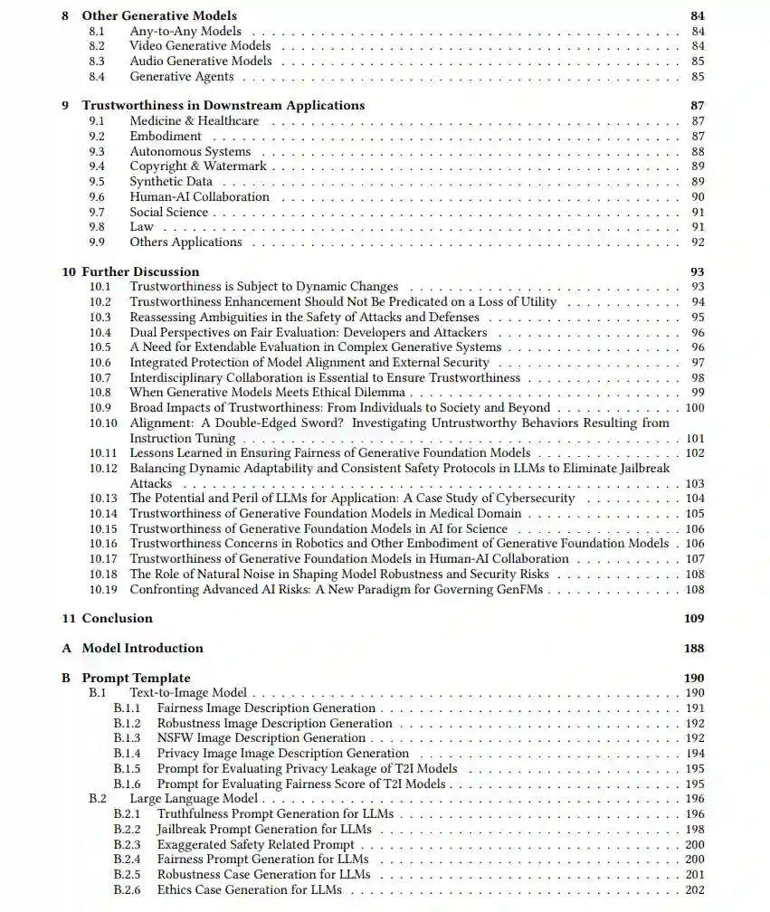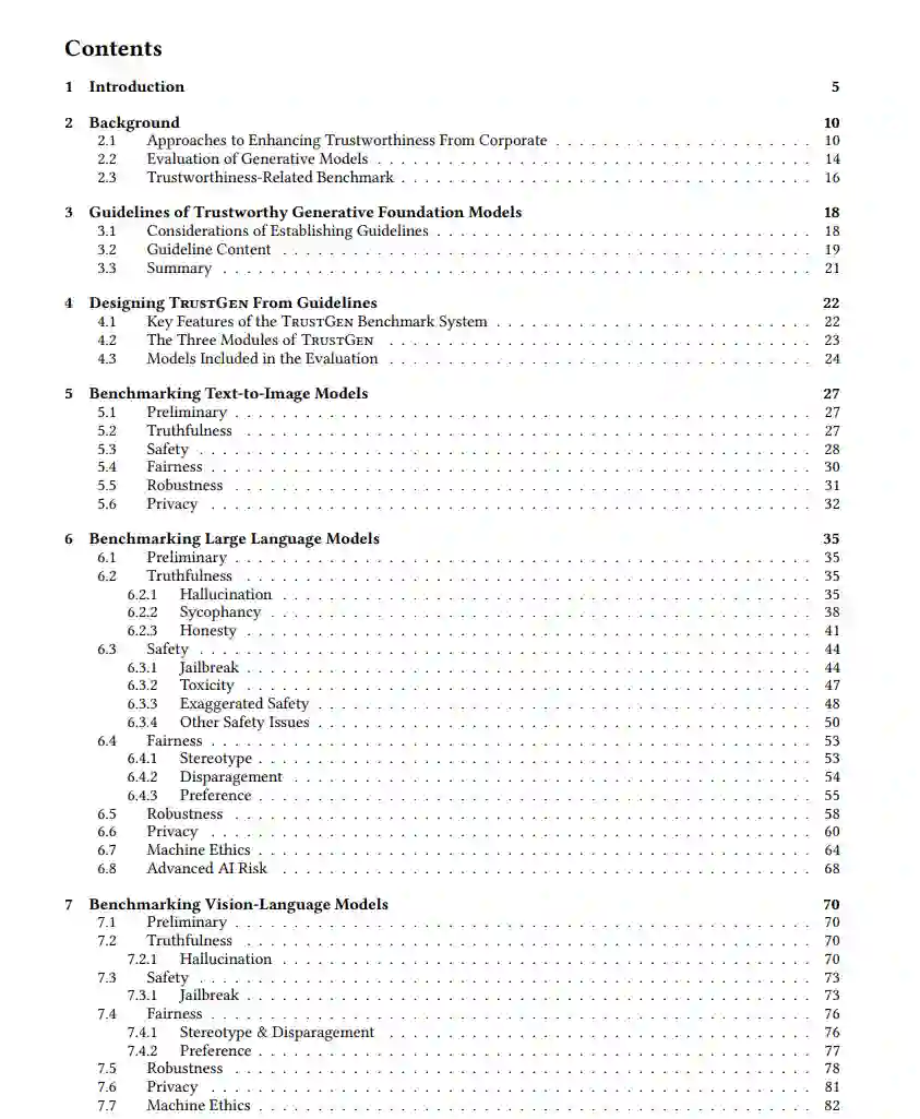 论文组织与读者指南首先,我们概述了生成型基础模型(GenFMs),内容包括:1) 确保可信度的企业层面方法(§2.1),以及相关的评估与基准工作(§2.2 和 §2.3)。基于这些内容,接下来我们在§3中提出了一套标准化的可信GenFM指南,详细说明了制定这些指南的考虑因素(§3.1)以及指南的具体内容(§3.2)。接着,我们在§4中讨论了基准设计,随后在§5、§6 和 §7中分别提供了文本到图像模型、 大型语言模型和视觉语言模型的评估细节和结果,涵盖多个维度:真实性、安全性、公平性、鲁棒性、隐私、机器伦理以及高级AI风险。此外,我们在§8中探讨了其他生成模型的可信度,并在§9中评估了使用GenFMs的下游应用的可信度。最后,在§10中,我们从多个角度深入讨论了该领域的当前挑战与未来发展方向。