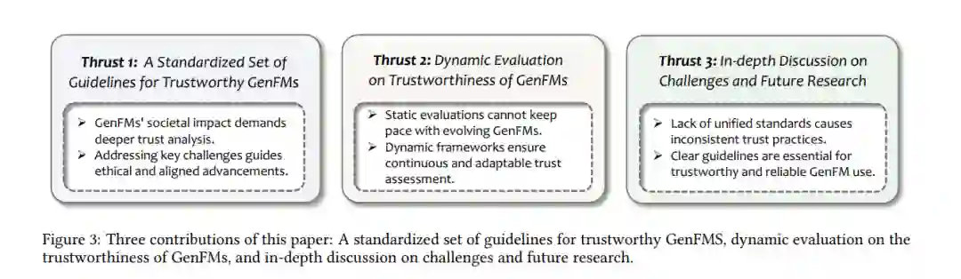 可信度的复杂性超出了仅靠指标和框架所能捕捉的范围。因此,为了确保对这一领域的全面理解并推动持续进展,我们在§10中对可信GenFMs的关键方面进行了深入讨论。通过探讨这些维度,我们强调了当前挑战并确定了有前景的研究方向,为未来的发展提供指导和信息,确保GenFMs的演进与人类价值观和社会期望保持一致。