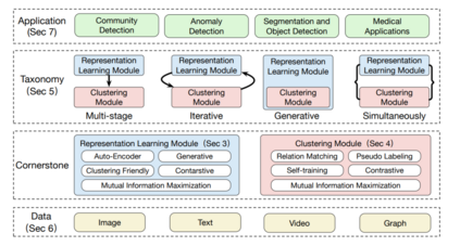 虽然浅聚类方法已经取得了巨大的成功,但它们假设实例已经在一个具有良好形状的潜在矢量空间中表示。随着过去几十年互联网和web服务的快速发展,研究人员对发现新的机器学习模型越来越感兴趣,这些模型能够处理没有明确特征的非结构化数据,如图像,以及具有数千维的高维数据等。因此,浅聚类方法不能再直接用于处理此类数据。近年来,深度学习的表示学习取得了成功,特别是在非结构化和高维数据中[166,201]。然而,在聚类过程中并没有探索深度学习技术。由于不能很好地捕捉到实例间复杂的关系,导致聚类结果欠佳。