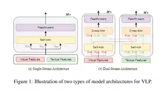 单流架构是指将文本和视觉特征连接在一起,然后输入单个Transformer模块,如 Firgue 1 (a) 所示。 双流架构是指文本和视觉特征没有连接在一起,而是独立发送到两个不同的Transformer块,如 Firgue 1 (b) 所示。 Encoder-only versus Encoder-decoder