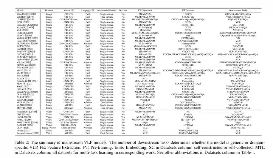 大多数 VLP 数据集是通过组合跨不同多模态任务的公共数据集构建的。然而,之前的一些工作,例如 VideoBERT、ImageBERT、ALIGN和 CLIP,处理从互联网收集的大量数据并使用他们自己构建的数据集进行训练。在这里,一些主流语料库及其规模信息如表 1所示。07 下游任务 各种各样的任务需要视觉和语言方面的合作知识。在本节中,我们将介绍此类任务的基本细节和目标,并将其分为五类:分类、回归、检索、生成和其他任务,其中分类、回归和检索任务也称为理解任务。 分类任务主要包括:Visual Question Answering (VQA)、Visual Question Answering (VQA)、NaturalLanguage for Visual Reasoning (NLVR).、VisualCommonsense Reasoning (VCR)等; 回归任务包括Multi-modal Sentiment Analysis (MSA); 检索任务主要指的是一些视觉-语言检索任务; 生成任务包括:Visual Dialogue (VD)、Visual Captioning (VC)等; 其他任务包括:Multi-modal Machine Translation (MMT)、Vision-Language Navigation (VLN).等。 更多细节描述详见论文 Section 6.08 SOTA VLP models 基于上述VLP模型的5大方面,我们对近几年的VLP模型进行了汇总整理: