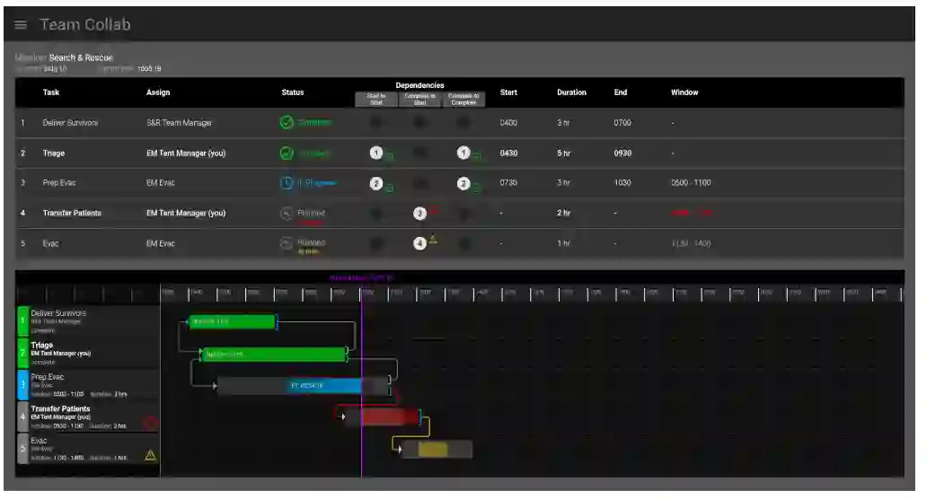 在军事研发领域,美军“联合全域指挥控制系统(JADC2)”的“任务规划与执行”需求明确,而利用AI辅助联合规划以处理数据支撑人类决策,是此类系统效能提升的核心。然而,还需设计“人类数据解读机制”以优化协同任务的同步与执行。本研究旨在通过“紧急医疗服务场景”评估互依性任务管理候选方案。研究证实,采用“时间线显示”界面处理“依赖关系问题”的准确率更高,仅在“状态问题”类型上其精度未显著优于其他显示模式。这表明“时间线显示”界面设计基于“基尔戈尔的时序区间逻辑关系可视化方法”具有显著有效性。