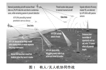 有人/无人机协同作战是指空战战场中由有人 机与具备一定自主能力的无人机构成的混合编队协 同遂行上级下达的一系列战役战术作战任务。其中 有人机主要发挥“大脑”作用,具体表现为:与后 方地面站指挥控制中心沟通联系,传达/下达任务分 配指令,前方战场突发情况应急处置等。无人机主 要发挥“肢体躯干”作用,具体表现为:接收并执 行上级下达的任务指令(攻击、监视、侦察、毁伤评 估、掩护诱导救援),提供局部战场态势感知、敌方 防区内火力部署情况、重要重点目标分布情况等高 价值情报信息等[1-4]。无人机投入战争使用至今已有数十年,然而其 智能化水平、自主能力以及可靠性等综合性能仍然 无法达到正常行为人的水平,这就决定了无人机在 战场上无法像人一样观察、思考、判断、决策、行 为,并且可以预见在未来相当长的一段时间内无人 机仍然无法企及这种水平。而战场上有人机中的战 机只是载体,“人类的好帮手”,真正的“掌舵者” 是人,何时攻击?如何攻击?攻击之后怎么办?这 一系列的思考、分析、动作、评估都需要以人为主(战 机为辅)来完成,以上事实毫无疑问都佐证了人类在 空战战场上无可替代的作用[5-8]。然而,有人机中的 人需要休息,无法全天候连续执行高强度工作,也 无法在不适宜人类生存的环境(火山、高辐射区域等)中工作,而且培养一名优秀战机飞行员也需要相 当长的时间与成本;因此,有人/无人机协同作战模 式应运而生。成本代价低的无人机能够全天候待命, 执行高强度高危以及某些特种工作,昂贵高度智能 的有人机能够在复杂多变的战场上临阵指挥,随机 应变,两者相辅相成,相得益彰,进而大力提升有 人机与无人机编队的整体作战效能[9-10]。有人/无人机协同作战在 20 世纪 90 年代由美军 率先提出,并且美国陆军、海军、空军也相继进行 了一系列理论与工程试验研究[11-12]。美国陆军于 20 世纪 90 年代初首次提出了以有人/无人直升机为研 究对象的“Bird Dog”项目,并于 20 世纪 90 年代 中期启动了机载有人/无人系统技术(airborne manned unmanned system technology,AMUST)项 目,在一系列相关概念与技术的提出与验证后,美 国陆军在 1999、2006、2011、2014、2016 年先后进 行了有人直升机(主要包括阿帕奇、基奥瓦等)与无 人机(主要包括猎人、影子、灰鹰等)协同作战的试 验验证。继美国陆军 1996 年启动 AMUST 项目后, 美国海军也于 1997 年启动了“海军版的有人/无人 机协同作战”项目—战术控制系统(tactical control system,TCS)项目,并于 2003、2014、2015 年相 继开展了一系列有人机(主要包括 P-3C、F/A-18、 AV-8B)与无人机(主要包括 RQ-8A、MQ-4C、 X-47B、UTAP-22)协同作战项目的试验验证。美国 空军紧随美国陆军、海军,于 2003 年启动了软件使 能控制(SEC)项目,2015 年,美国空军更是正式推 出了当下最著名的有人/无人机协同作战项目 ——“忠诚僚机”项目,直至今日,美国空军的“忠 诚僚机”有人机(主要包括 F-16 等)与无人机(主要 包括海弗-空袭者等)协同作战项目已经进行了多次 试验验证。此外,俄罗斯、英国、法国、澳大利亚、 日本等国也先后开展了有人/无人机协同作战项目 的研究[13-17]。