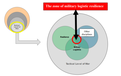 图:本文的范围位于战争的战术层面及其研究差距,后续研究解决这一差距在于“军事后勤弹性区域”,如图所示。