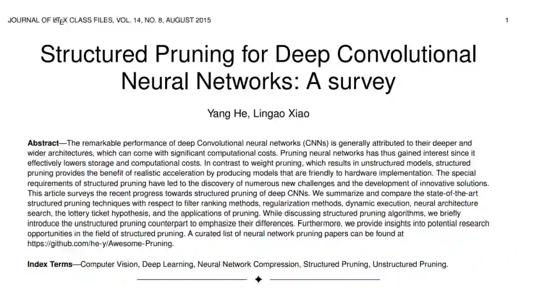 深度卷积神经网络(CNN)在广泛的应用中表现出了卓越的性能,包括图像分类[1]、目标检测[2]和图像分割[3]等。许多CNN结构被提出,包括AlexNet [4], VGGNet [5], inception [6], ResNet[7]和DenseNet[8]。这些架构包含数百万个参数,需要巨大的计算能力,使得在资源有限的硬件上部署具有挑战性。模型压缩是该问题的一种解决方案,旨在减少参数数量、计算成本和内存消耗。因此,它的研究变得越来越重要。 **为了生成更高效的模型,模型压缩技术被提出,包括剪枝[9]、量化[10]、分解[11]和知识蒸馏[12]。**术语“剪枝”指的是删除网络的组件,以产生用于加速和压缩的稀疏模型。剪枝的目的是在不显著影响模型性能的情况下最小化参数的数量。大多数关于剪枝的研究都是在用于图像分类任务的CNN上进行的,这是其他计算机视觉任务的基础。 剪枝可分为非结构化[9]和结构化剪枝[13]。非结构化剪枝删除神经网络的连接(权重),导致非结构化稀疏性。非结构化剪枝通常会导致高压缩率,但需要特定的硬件或库支持以实现实际的加速。结构化剪枝删除了神经网络的整个滤波器,并可以利用基本线性代数子程序(BLAS)库等高效库的优势,用标准硬件实现实际的加速和压缩。在transformer[14]时代,从结构化剪枝的角度重新审视cnn的属性是有意义的。最近,将CNN的架构设计纳入Transformer模型[15],[16],[17],[18],[19]的趋势越来越大。尽管transformer中的自注意力[20]在计算序列表示方面是有效的,但由于transformer缺乏归纳偏差[17],[21],[22],仍然需要大量的训练数据。相比之下,cnn的结构在权重上实施两个关键的归纳偏差:局部性和权重共享,以提高学习算法的泛化性,并且独立于数据[17]。本综述提供了对CNN的更好理解,并为未来有效设计架构提供了提示。
